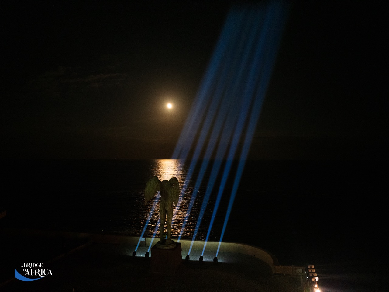 In the former Piazza d’Armi, overlooking the Ionian Sea and facing Africa, seven beams of light – echoing those crossing the sky from the Umbertino Bridge – casting their glow toward the African continent.