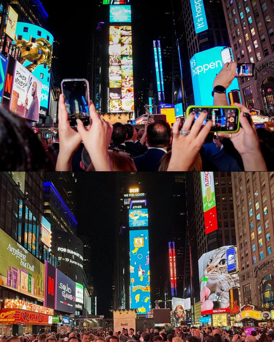 L’elemento più affascinante del progetto è stato l’elemento site-specific legato agli schermi LED della metropoli: per raggiungere il risultato è stato necessario rispettare precisi requisiti tecnici e svolgere diverse prove, così da garantire un adattamento ottimale ai supporti di Times Square.